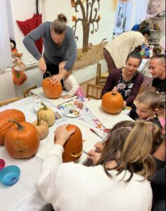 A gyerekek és a szülők közösen vettek részt a hangulatos tökfaragó délutánon a Csiga csoportban, ahol mindenki szabadon alkothatott, és megmutathatta kreativitását.