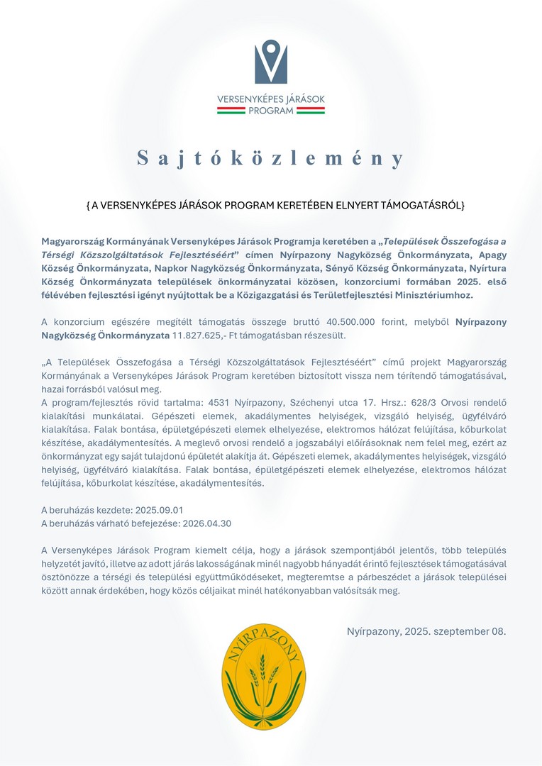 A Nyírpazony, Napkor, Apagy, Nyírtura és Sényő önkormányzatai közösen jelentkeztek a pályázatra, hogy a térség fontos közszolgáltatásait fejlesszék. A nyert összeg mindegyik településen konkrét, helyi igények alapján meghatározott beruházásra fordítódik: