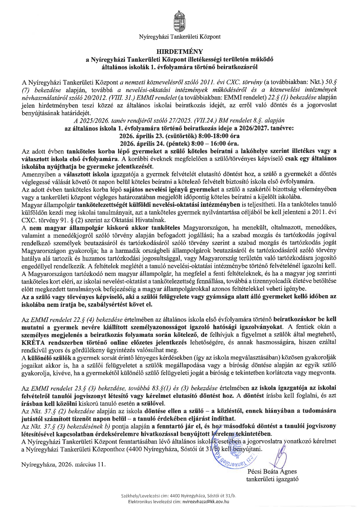 Aktuális Nyíregyházi Tankerületi Központ 2026/2027-es tanévre vonatkozó beiratkozási hirdetmény By Hivatal 2026-03-12 Bejegyzés navigáció Previous post: Vidéki idill, modern infrastruktúra – ilyen helyen élni álom, és csak öt percre van Nyíregyházától (fotók, videók)