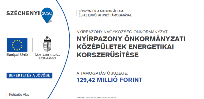 Tisztelt Nyírpazonyi Lakosok! Nyírpazony Nagyközség Önkormányzata sikeresen pályázott KEOP épületenergetikai fejlesztésre 129 millió forint összegben. A kivitelezési munkálatok főként külső … More Tisztelt Nyírpazonyi Lakosok!